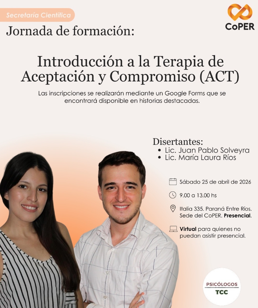 La Secretaría Científica invita a la jornada “Introducción a la Terapia de Aceptación y Compromiso (ACT)”, a cargo de Juan Pablo Solveyra y María Laura Ríos, referentes de Psicólogos TCC.